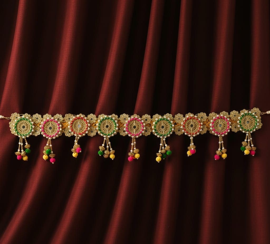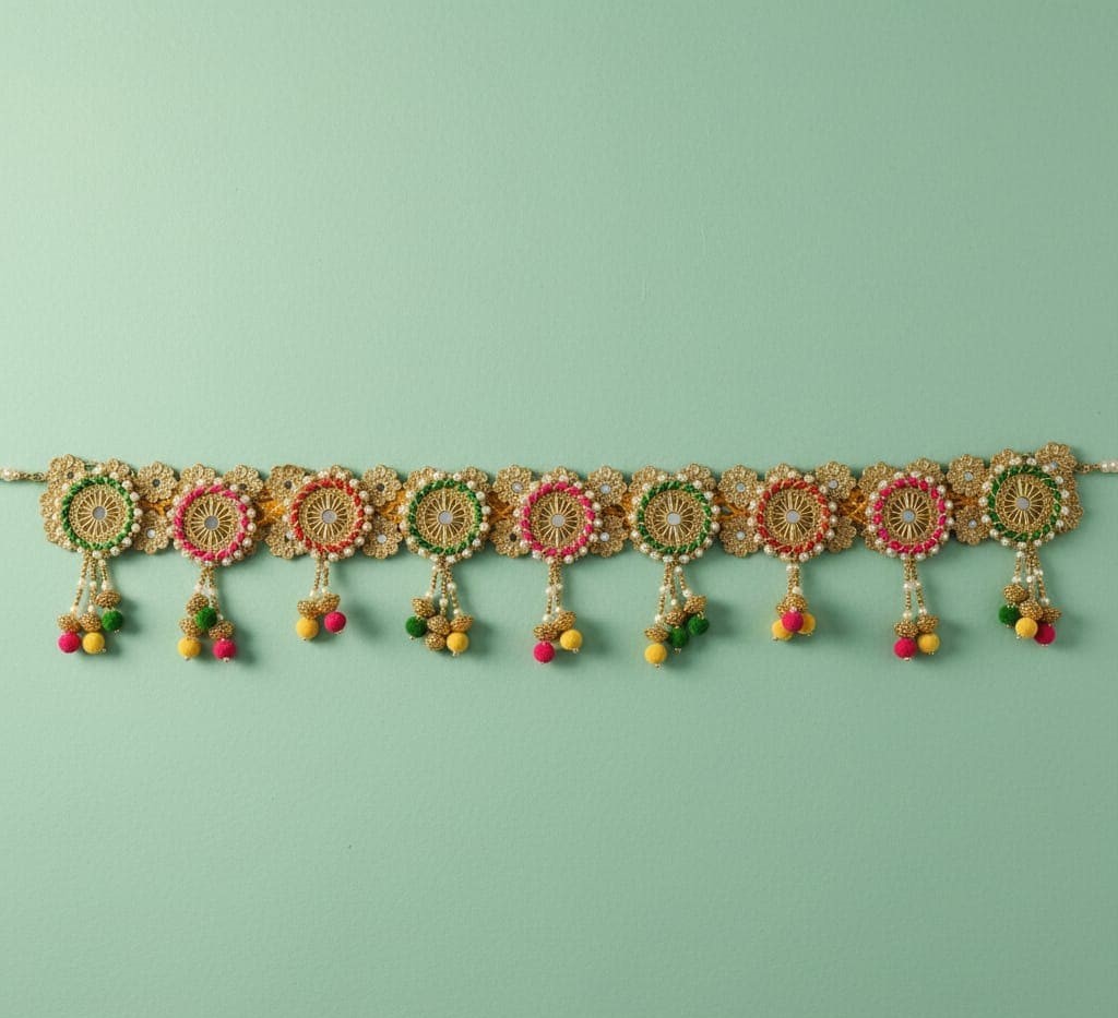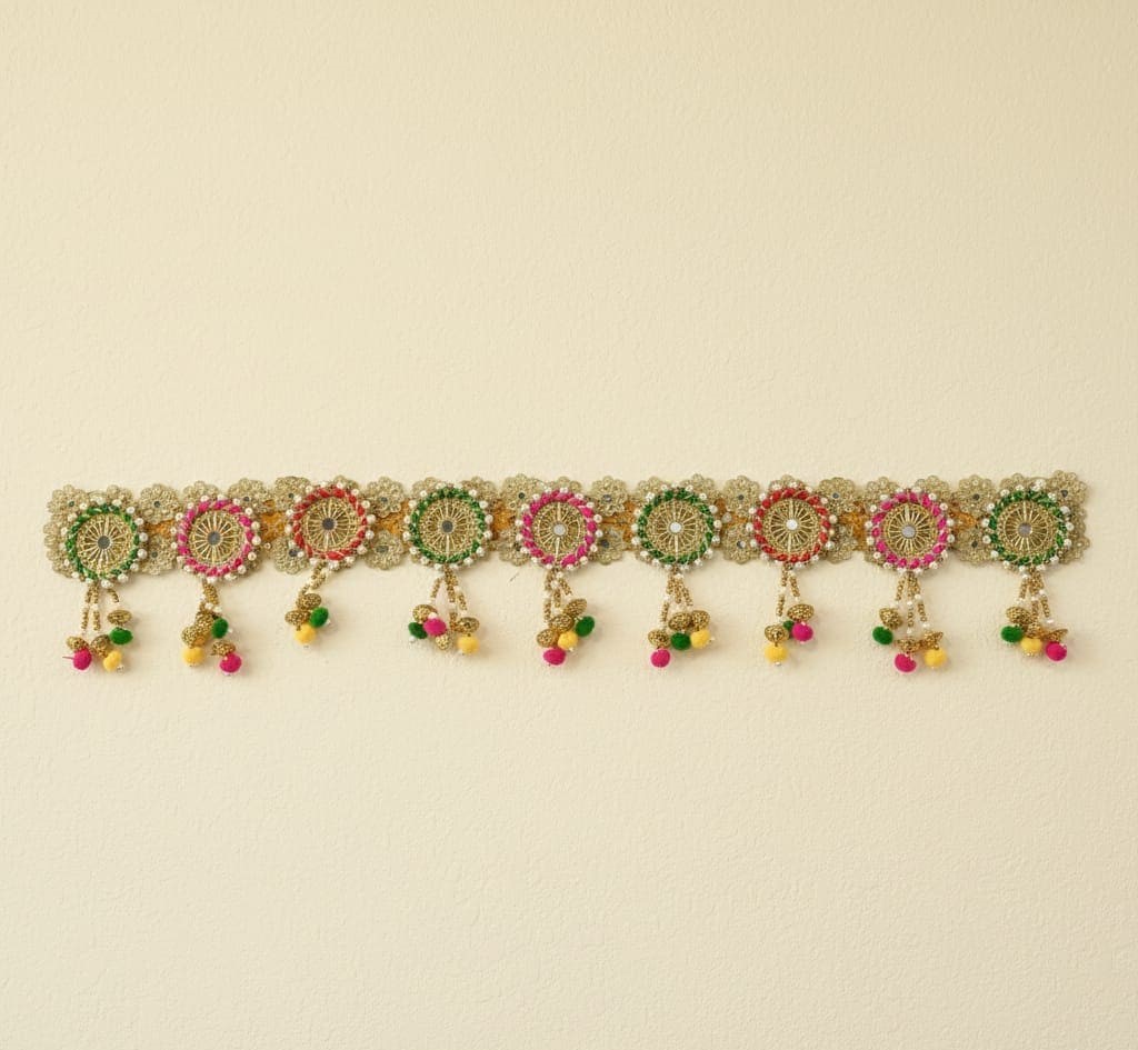 Adorn your entryway and invite auspicious energy (Shubh Labh) with this dazzling Multi-Color Chakra & Pom-Pom Toran from Yugalkishor Shringar! This traditional Bandarwal is a riot of festive colors and textures, featuring prominent Chakra motifs (symbolizing divine order and protection), playful Pom-Poms, and delicate Pearl and gold accents. It is the perfect decoration to announce celebrations, welcoming guests and divinity alike for Diwali, weddings, festivals, and all special puja ceremonies.